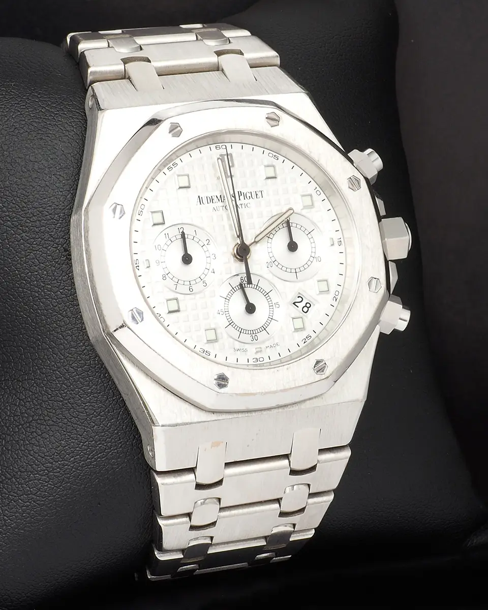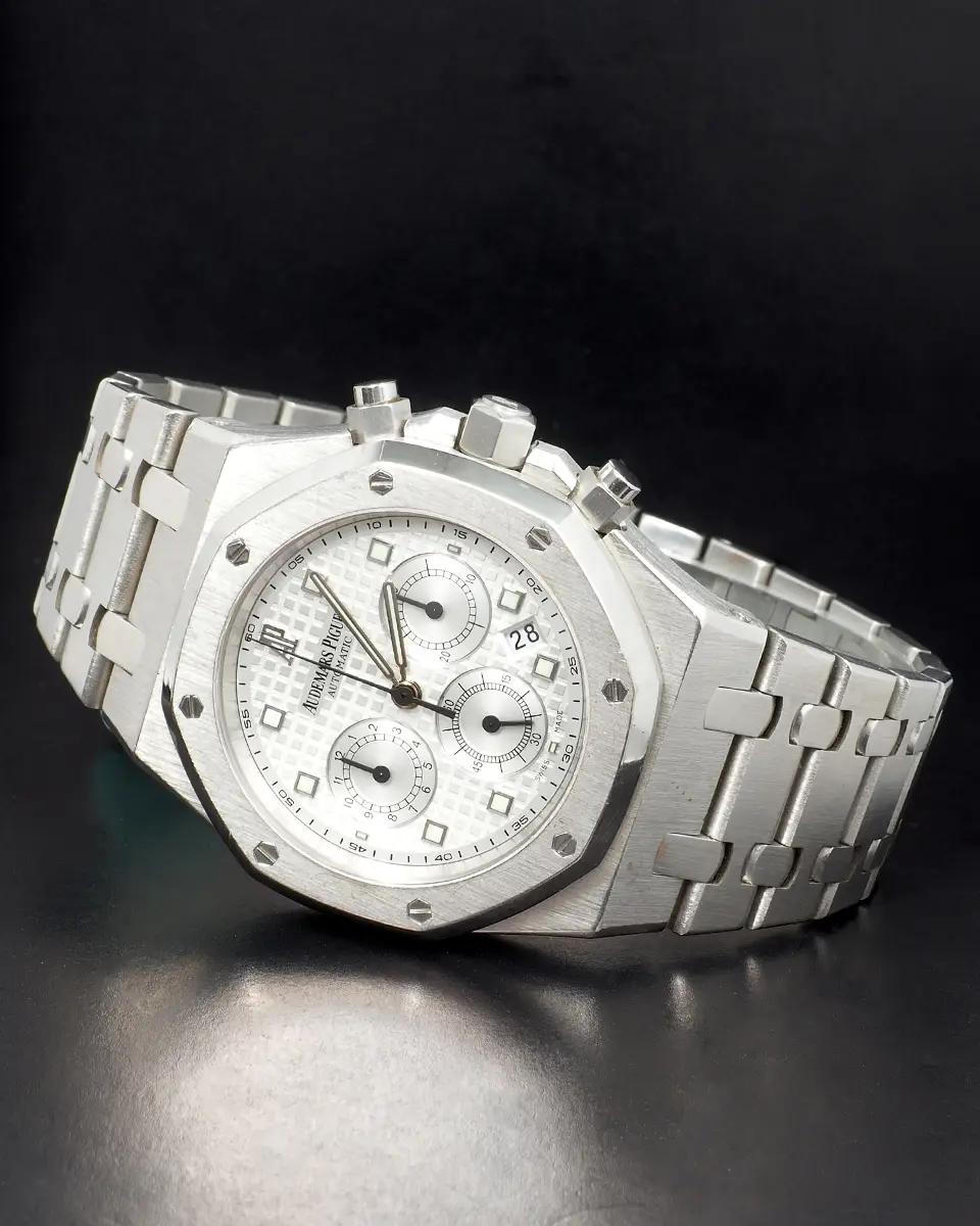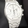 Audemars Piguet Royal Oak Chronograph reference 25960BC cased in white gold and put together by a white gold bracelet. The watch is powered by an automatic movement and is accompanied by our 2 year warranty and lifetime guarantee of authenticity.