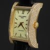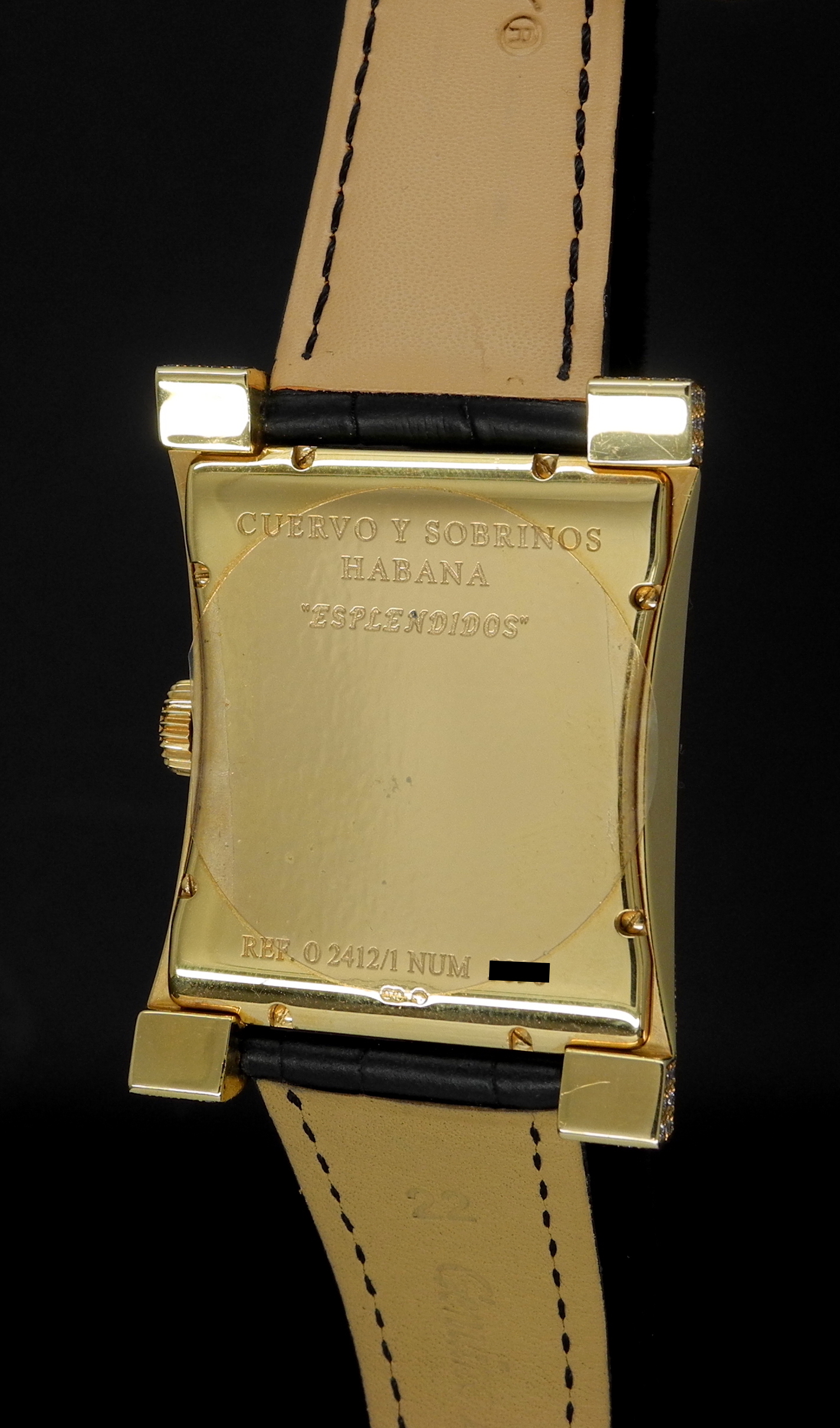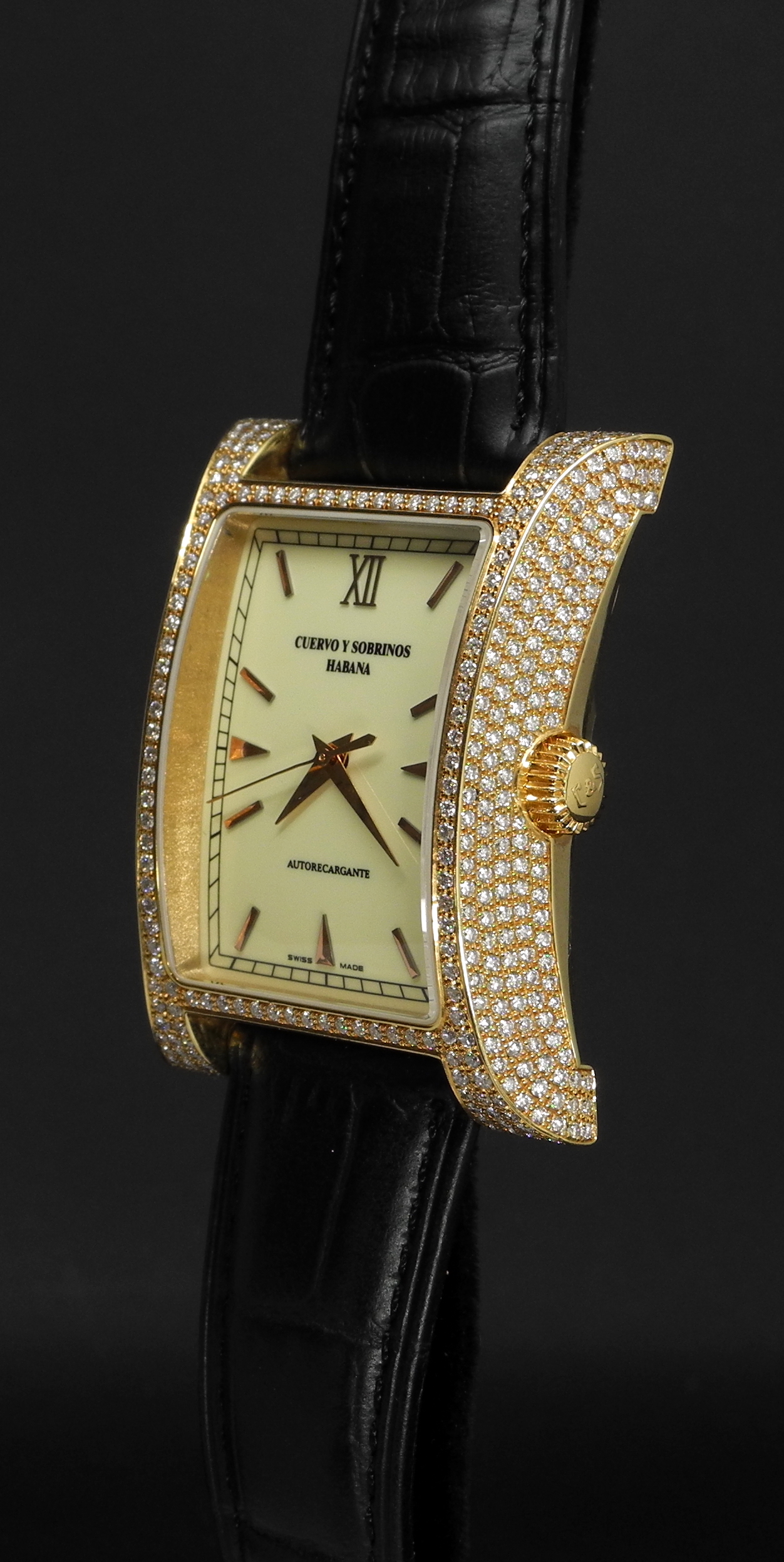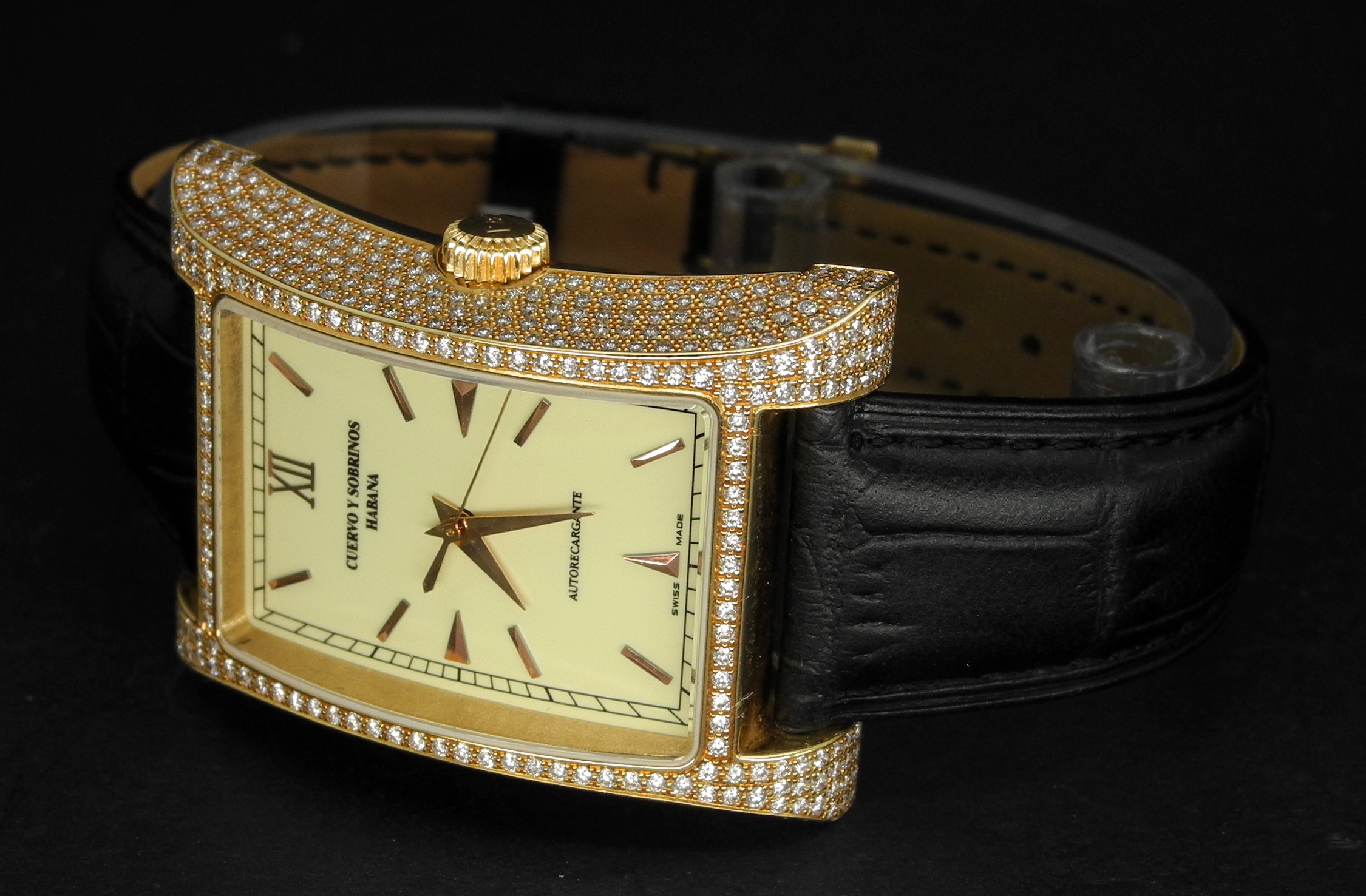 Cuervo y Sobrinos Esplendidos automatic watch cased in pink gold fitted with full pave diamonds and a flawless cream dial. This watch comes with its original black strap and signed clasp.
