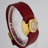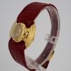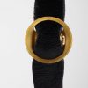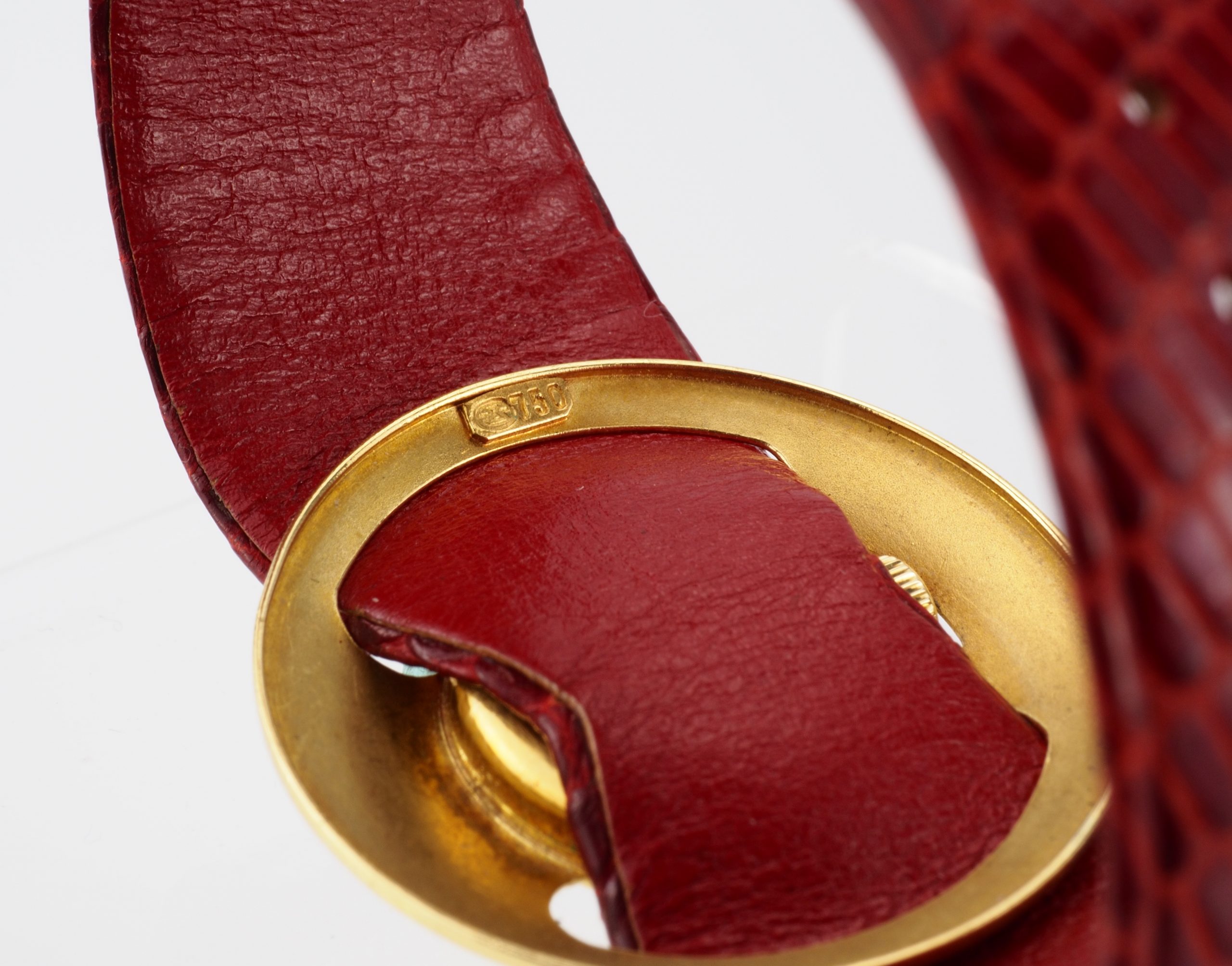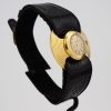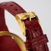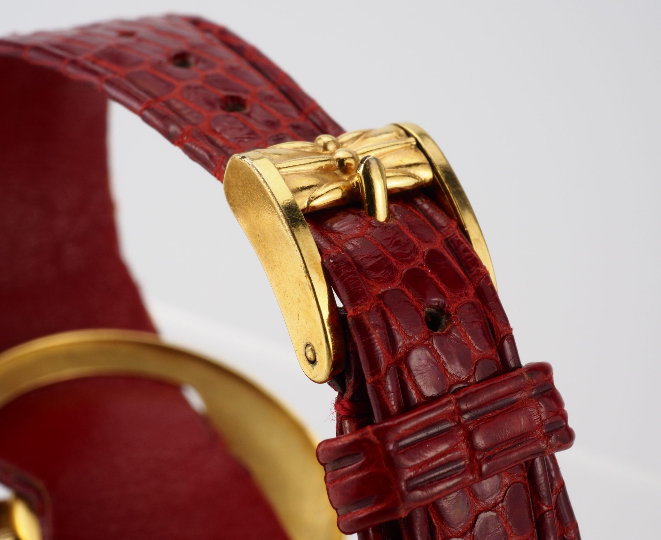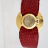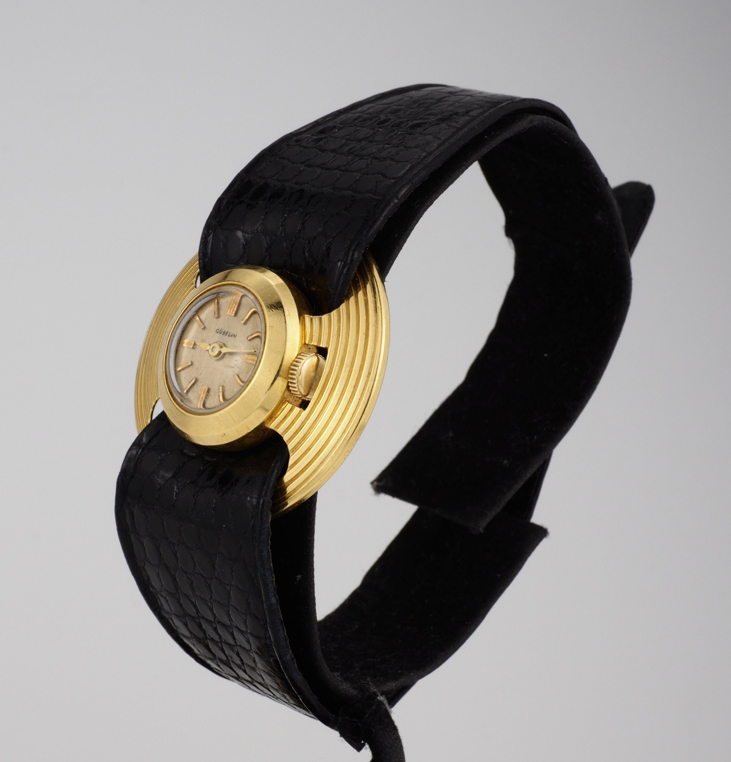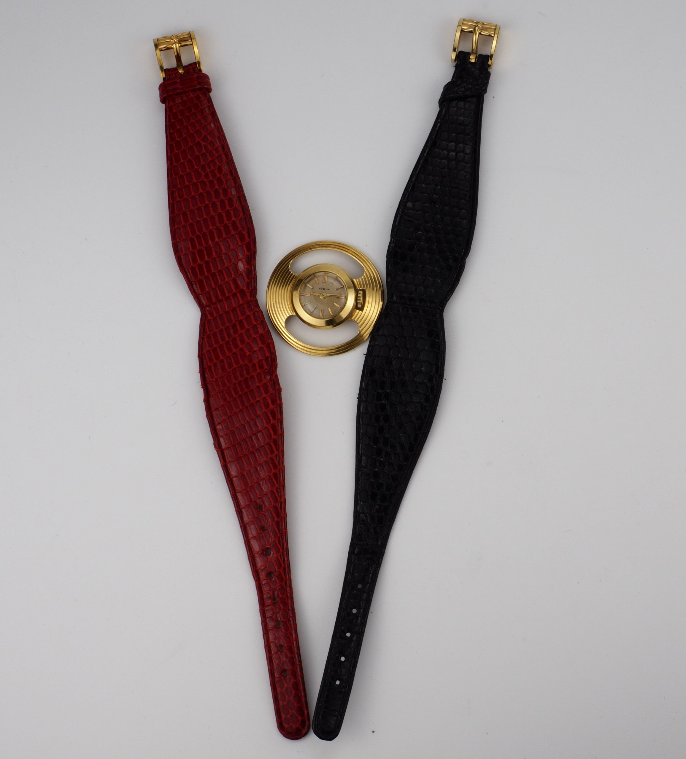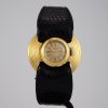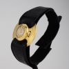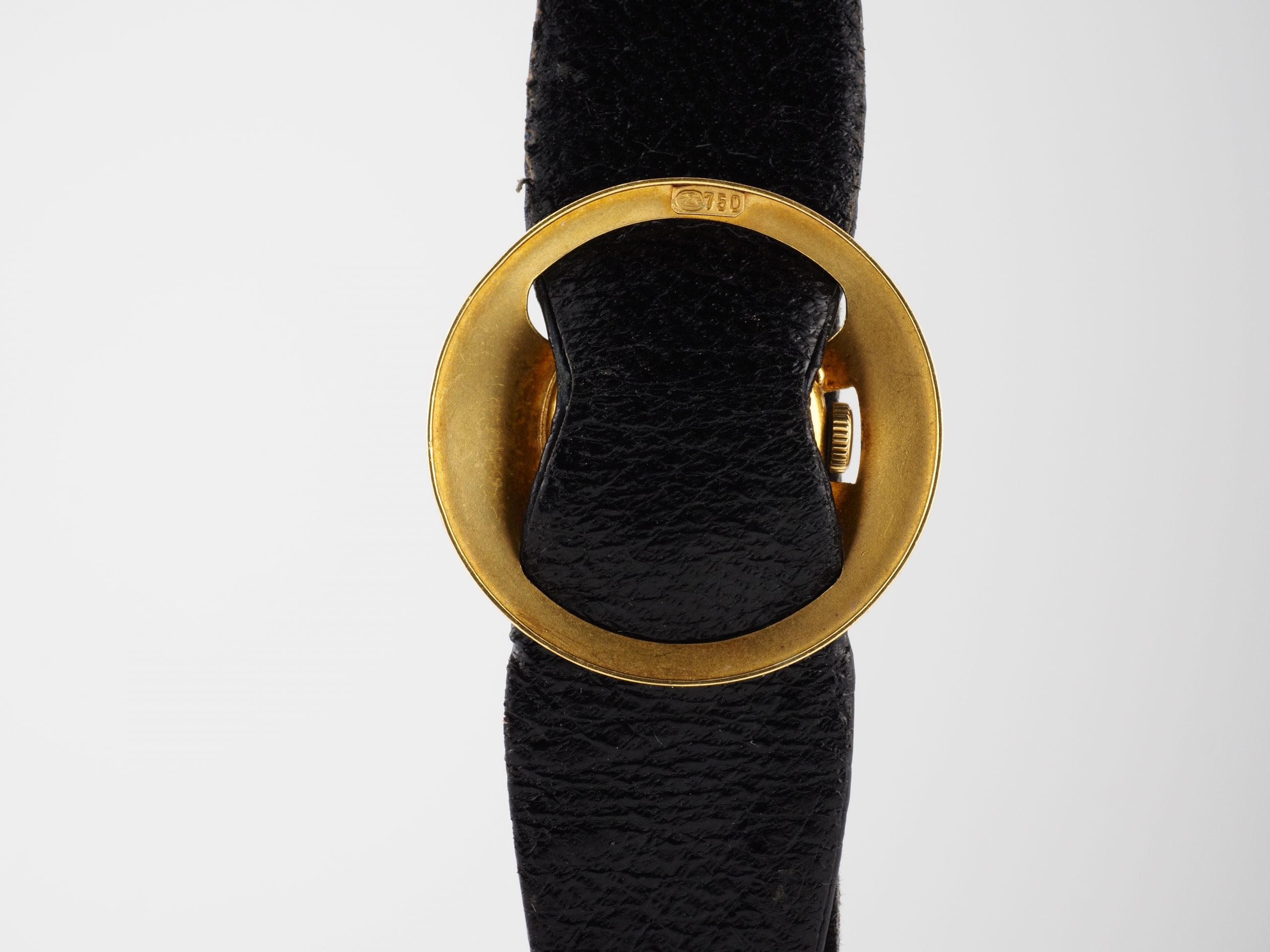 The integration of the strap is equally elegant. A wide scaled black leather strap passes seamlessly beneath the gold disc, reinforcing the sculptural effect and reflecting the inventive design language associated with high jewelry watches of the era.