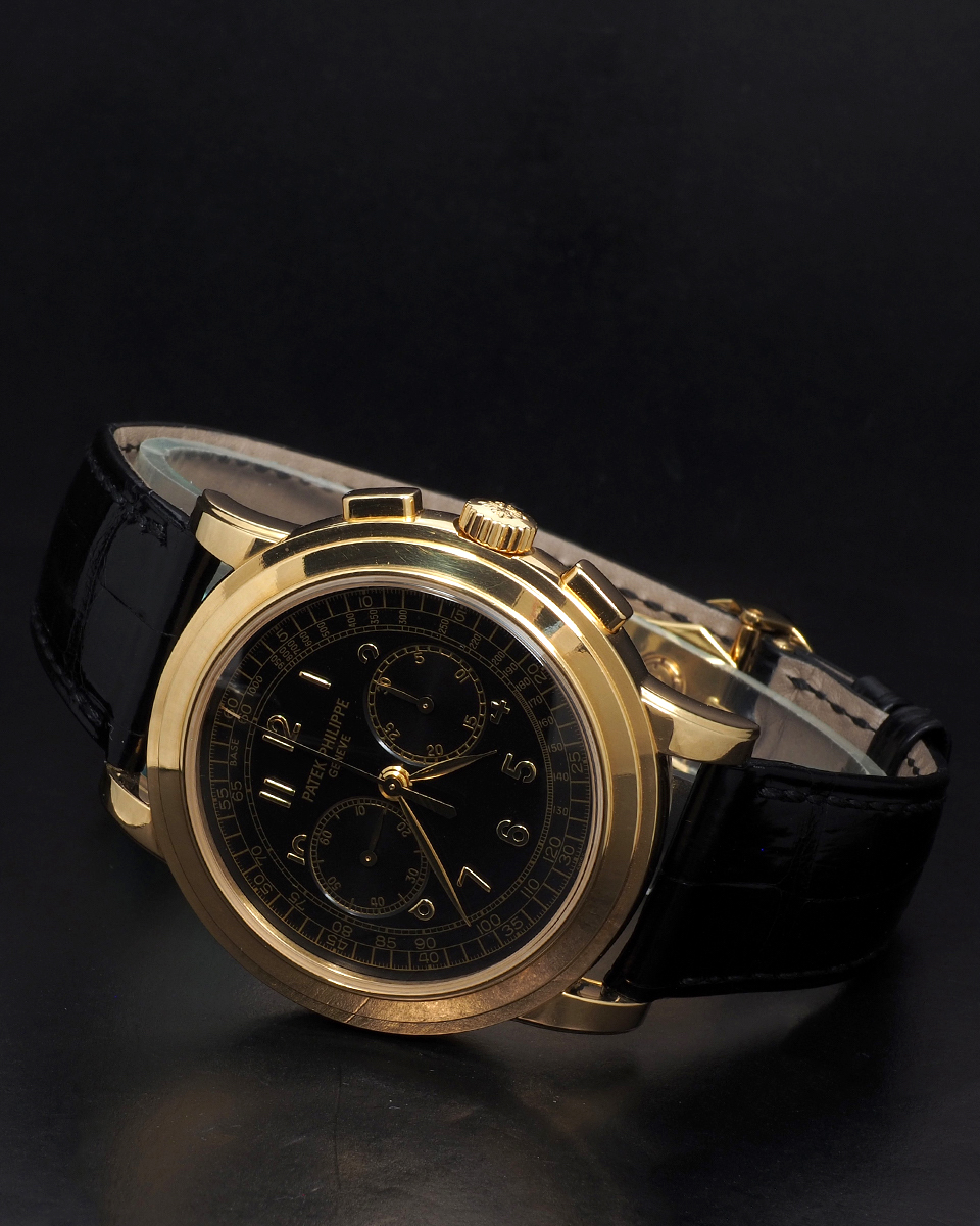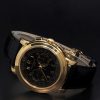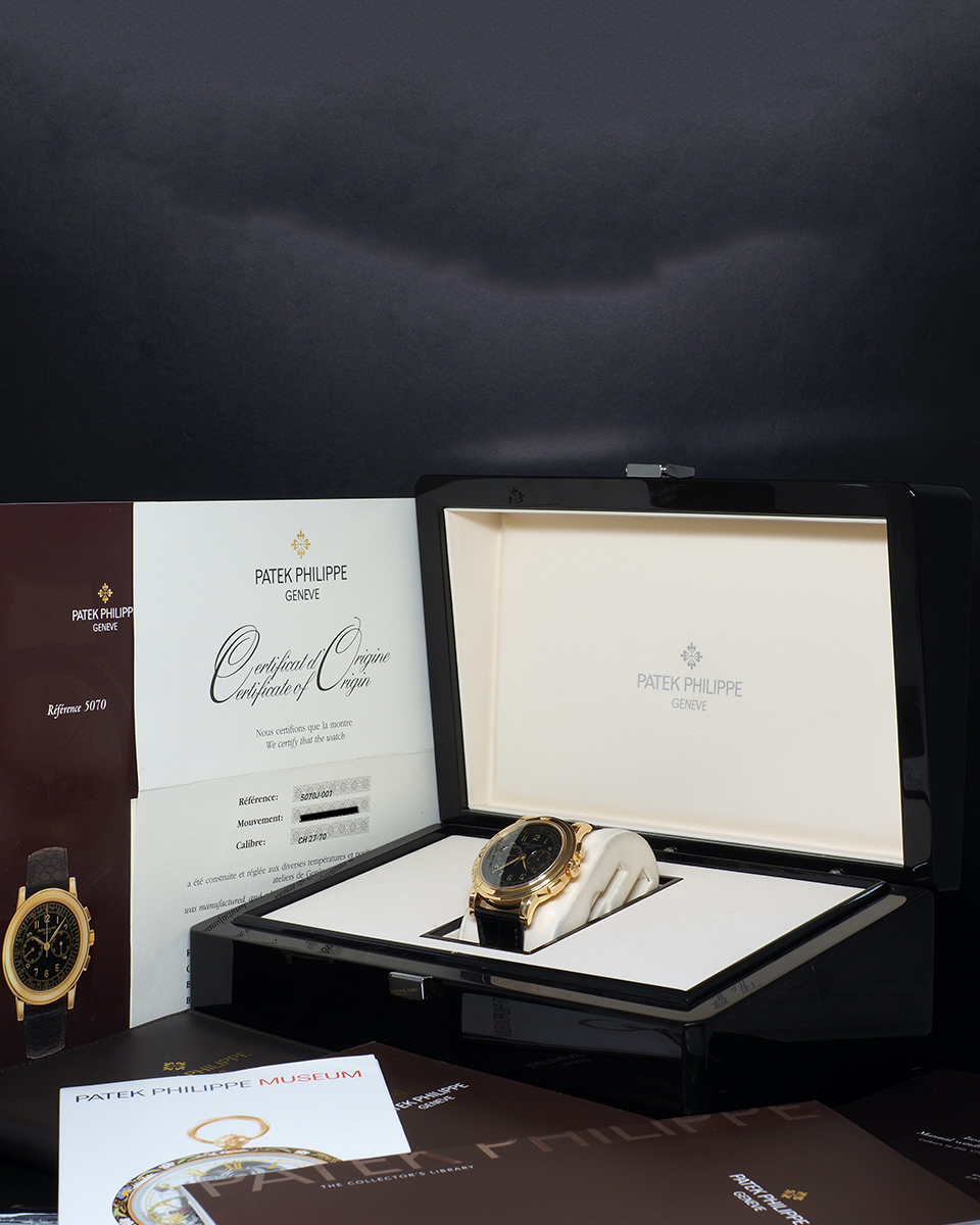 Patek Philippe Chronograph reference 5070 cased in yellow gold and fitted with an attractive black dial. Powered by the revered Lemania based manual movement and accompanied by its complete set of box and papers. This Patek has long remained an undervalued watch but it appears the market has finally woken up to its beautiful design and fantastic dial layout. Also included with the 5070J is our 2 year warranty and lifetime guarantee of authenticity.