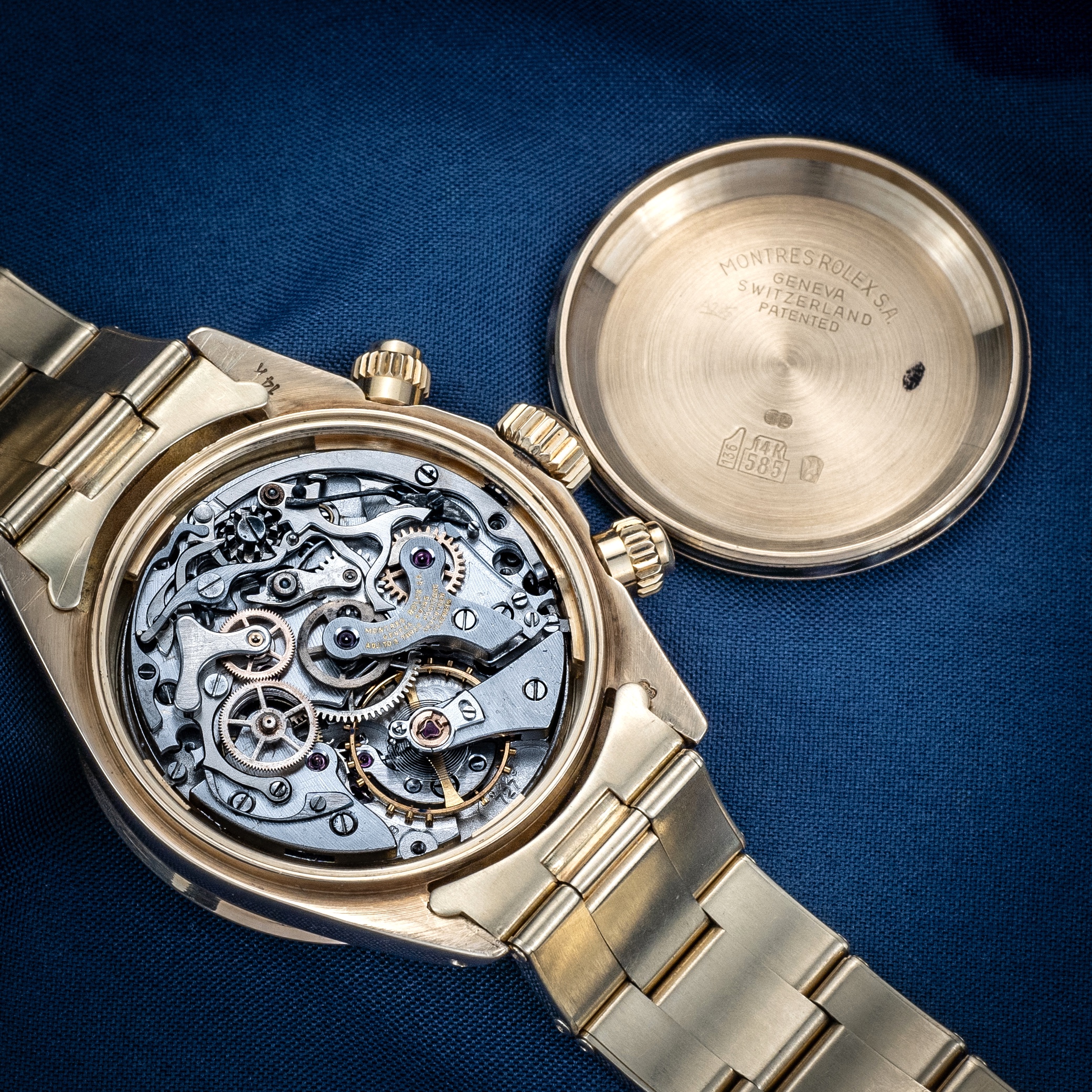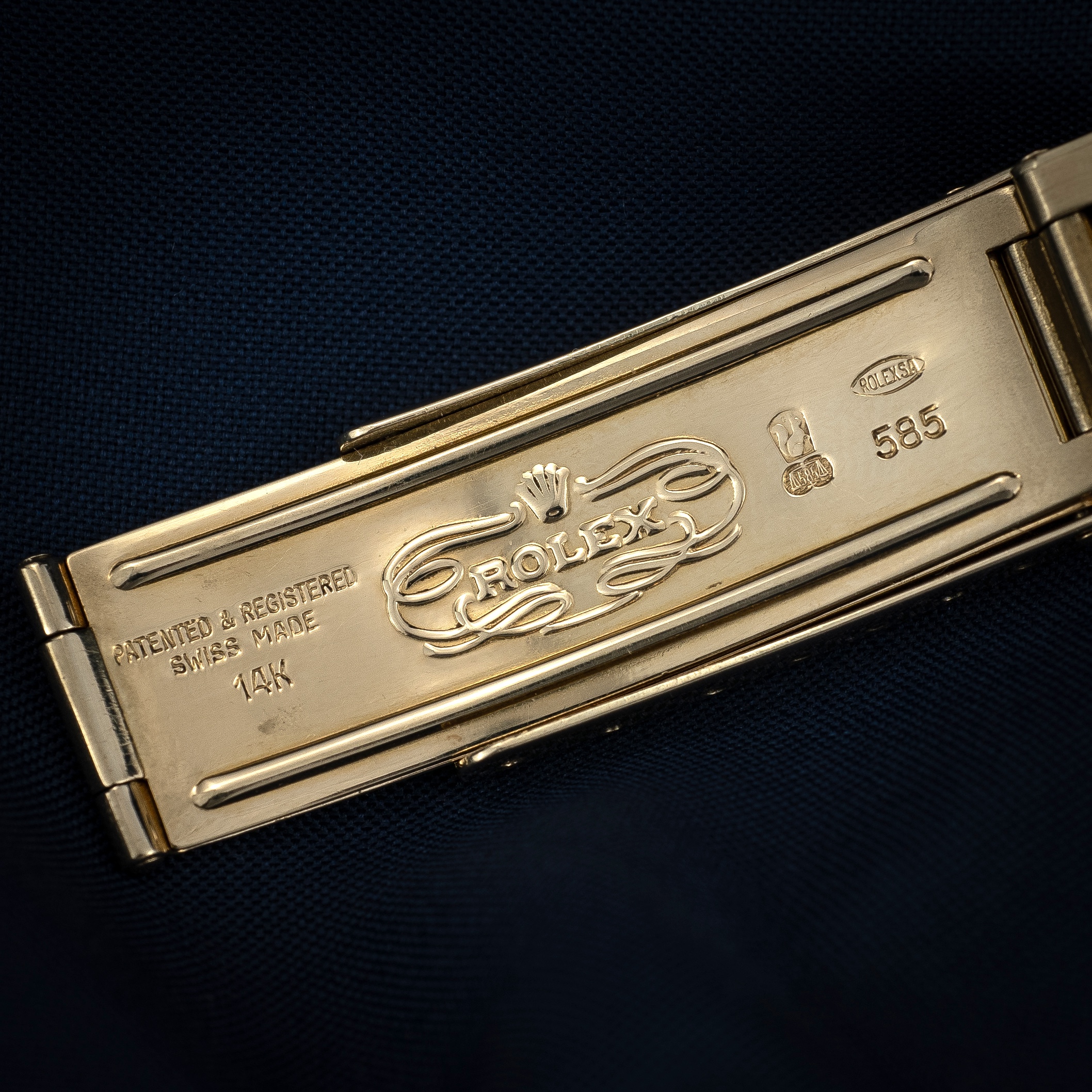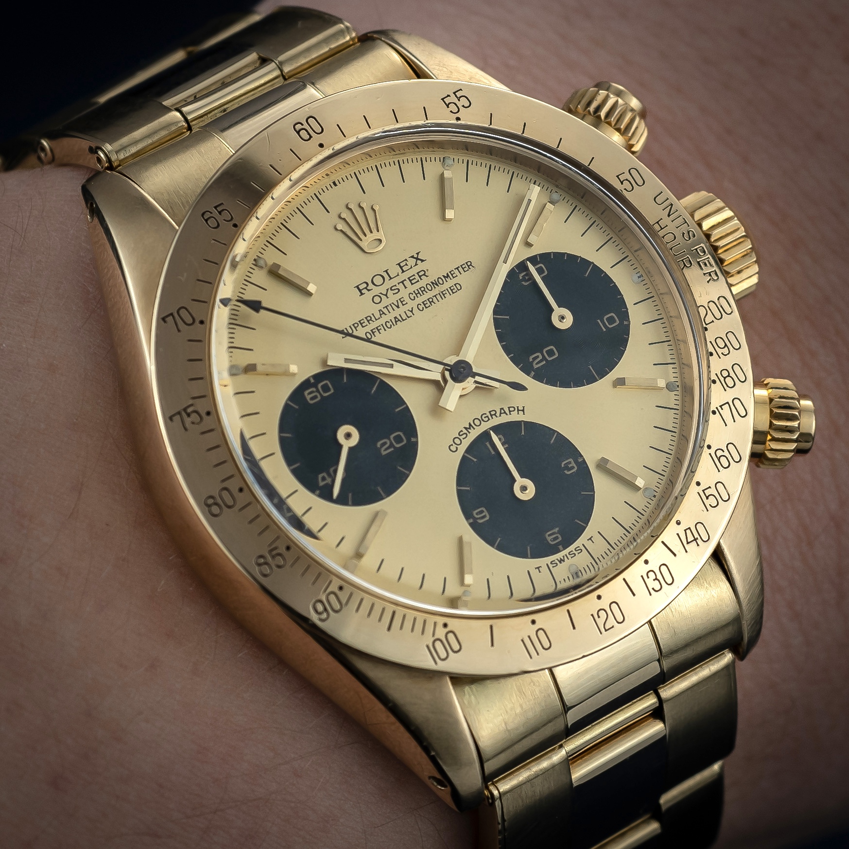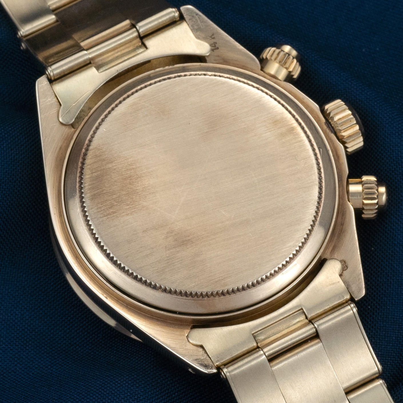 Rolex Daytona Cosmograph reference 6265 in 14kt yellow gold on rivet oyster bracelet, produced for the US market. The reference 6265 was introduced in 1972 until Rolex moved to automatic Daytonas in 1988. This reference is characterized by its screw-down chronograph pushers, which were first experimentally introduced in 1965 with the ref. 6240. This important innovation, along with the use of a 7mm Triplock crown, ensures its water resistance, as indicated by the word “Oyster” on the dial. The bezel is made of metal (stainless steel or gold) with an engraved tachymeter scale, similar to that of the earlier Rolex Cosmograph ref. 6262, which the Daytona ref. 6265 replaces.