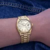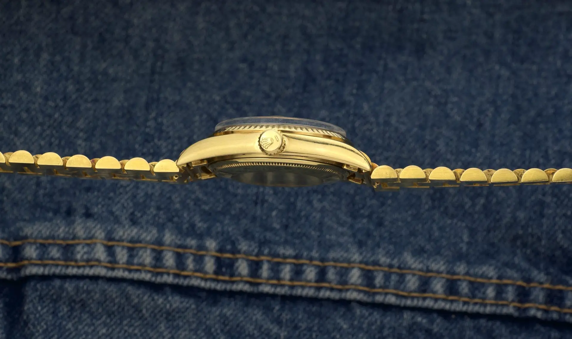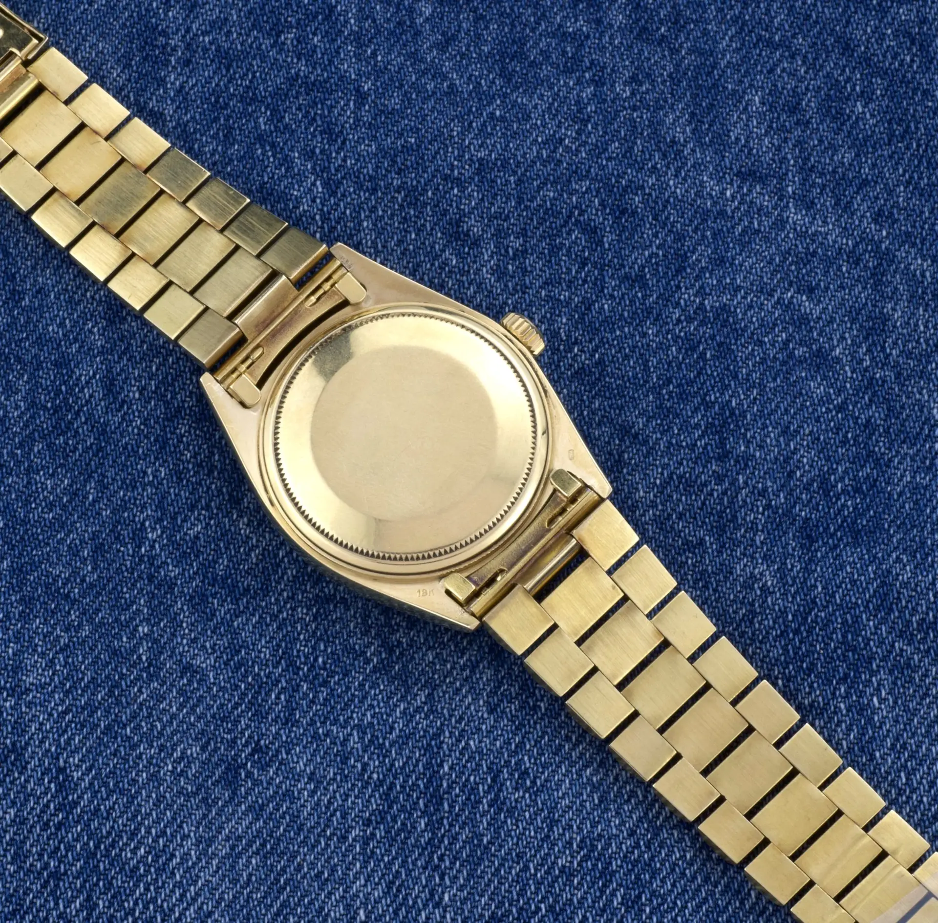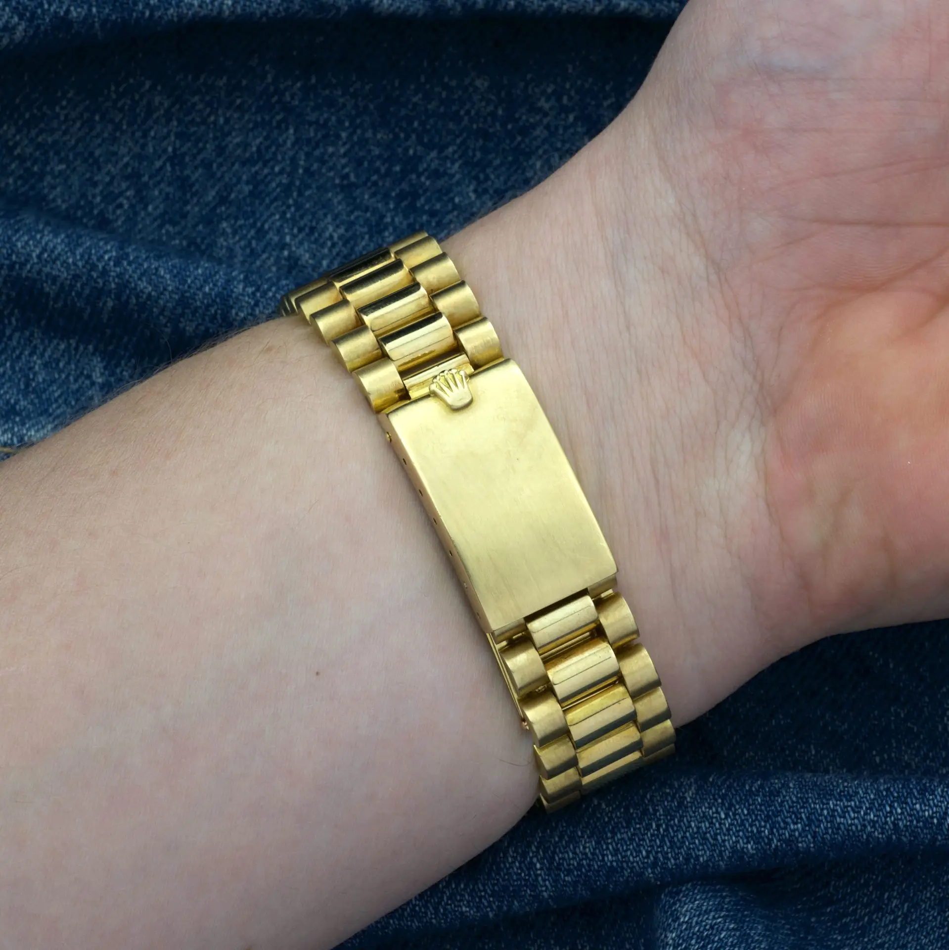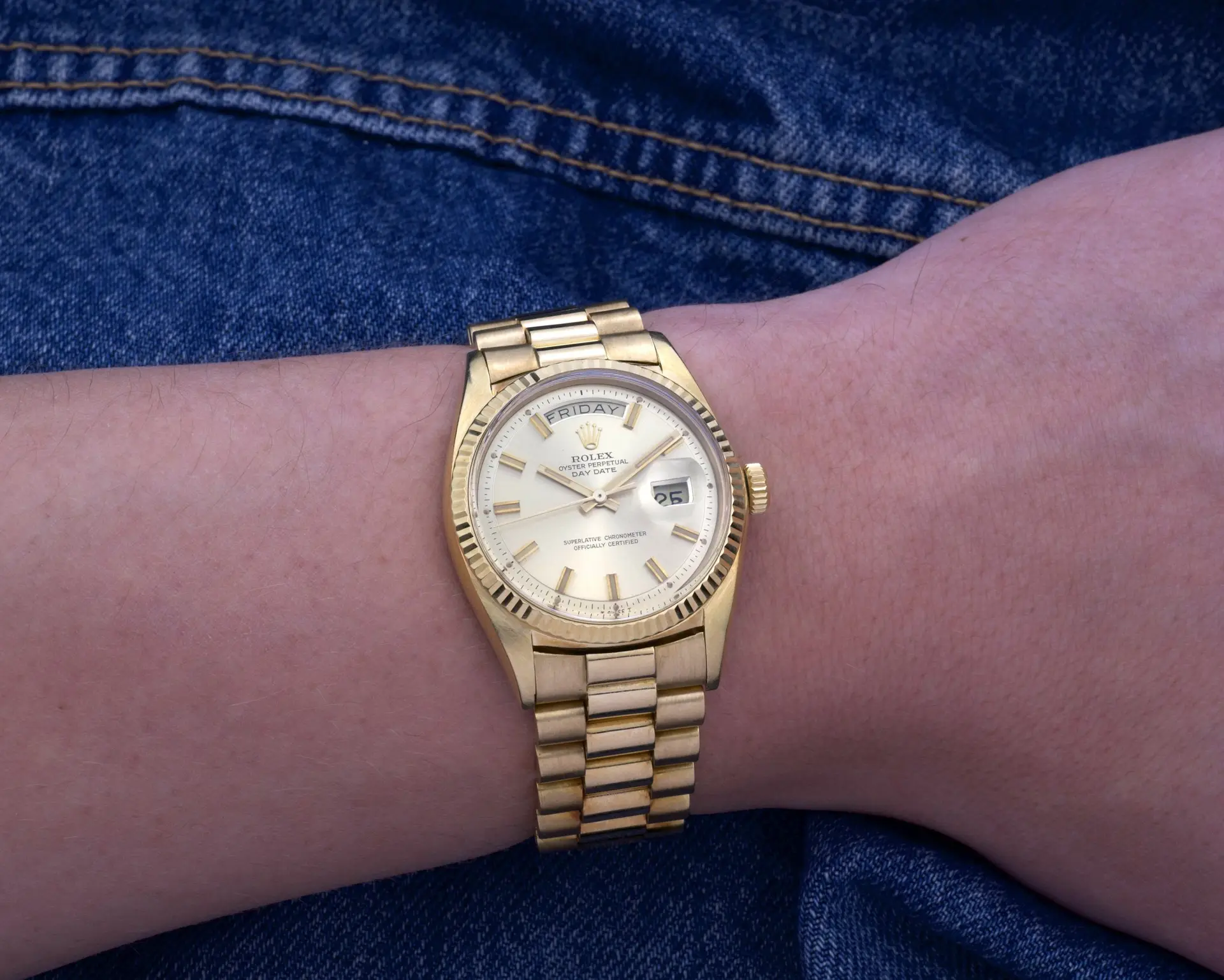Rolex Day-Date reference 1803 in 18kt white gold. Bearing an english day disc and the so-called “Wide Boy” dial due to the extra wide indexes and sunburst finish, which has a simple yet very glowing look. Powered by caliber 1556, manufactured in 1971.