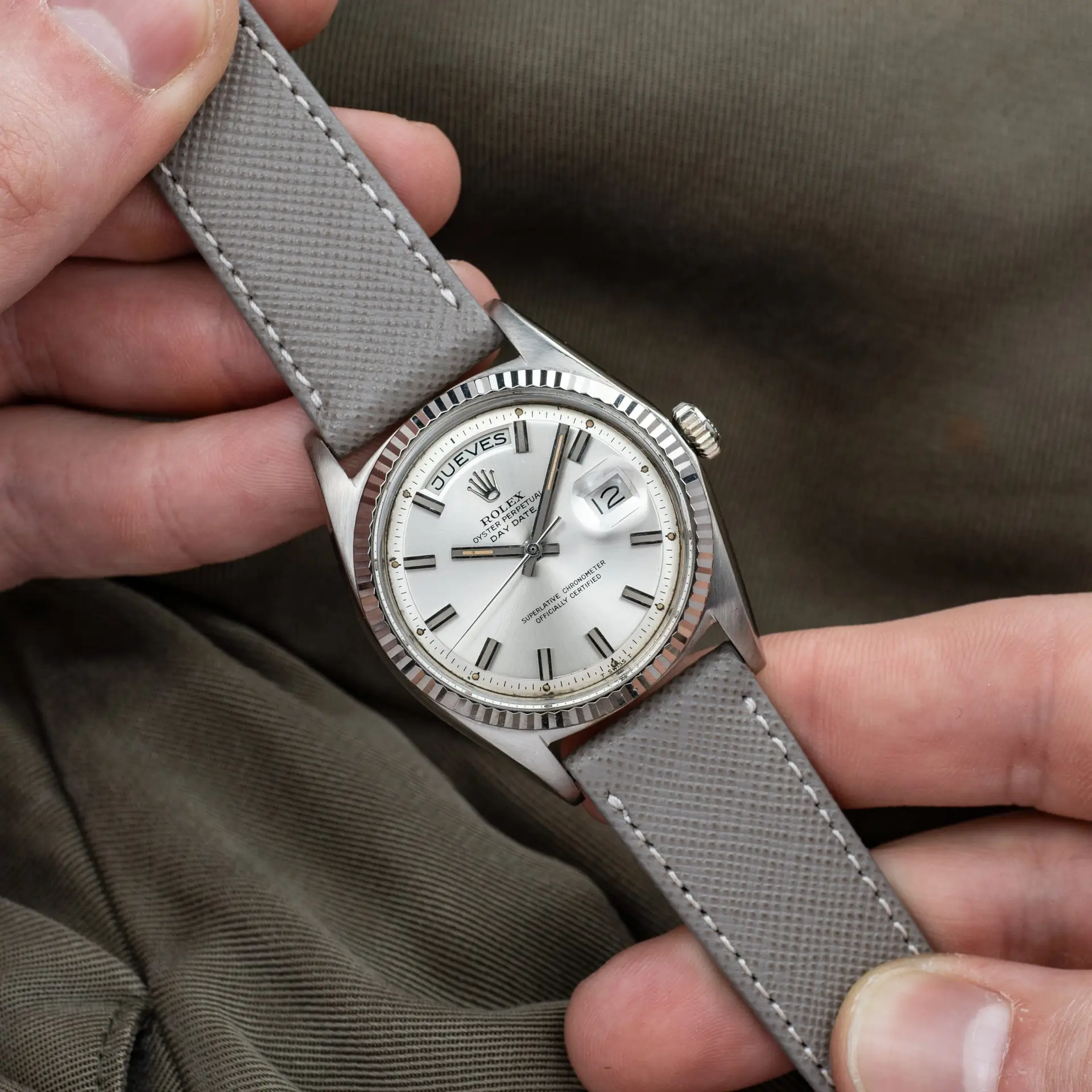 Rolex Day-Date reference 1803 in 18kt white gold. Bearing a spanish day disc and the so-called “Wide Boy” dial due to the extra wide indexes and sunburst finish, which has a simple yet very glowing look.