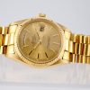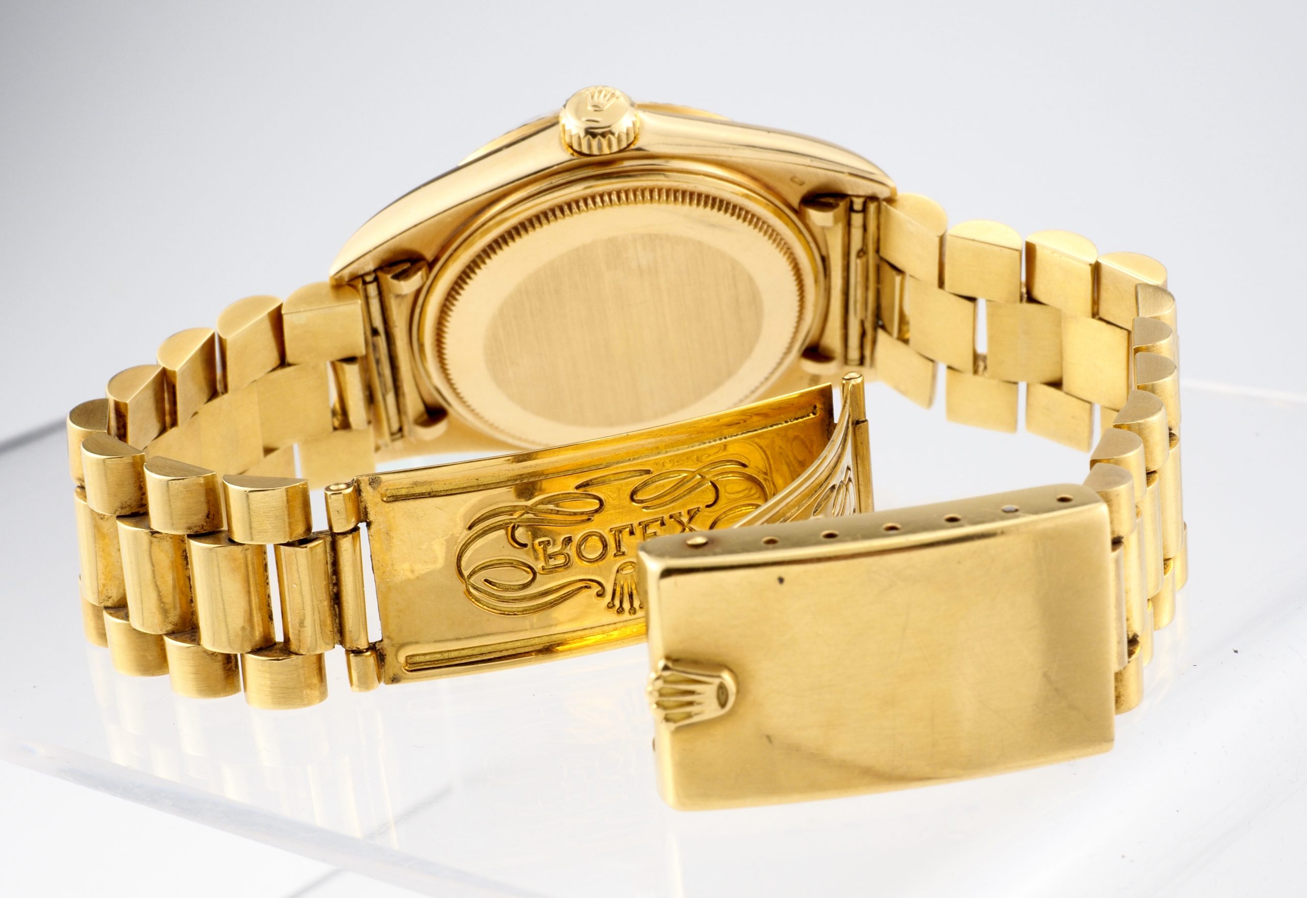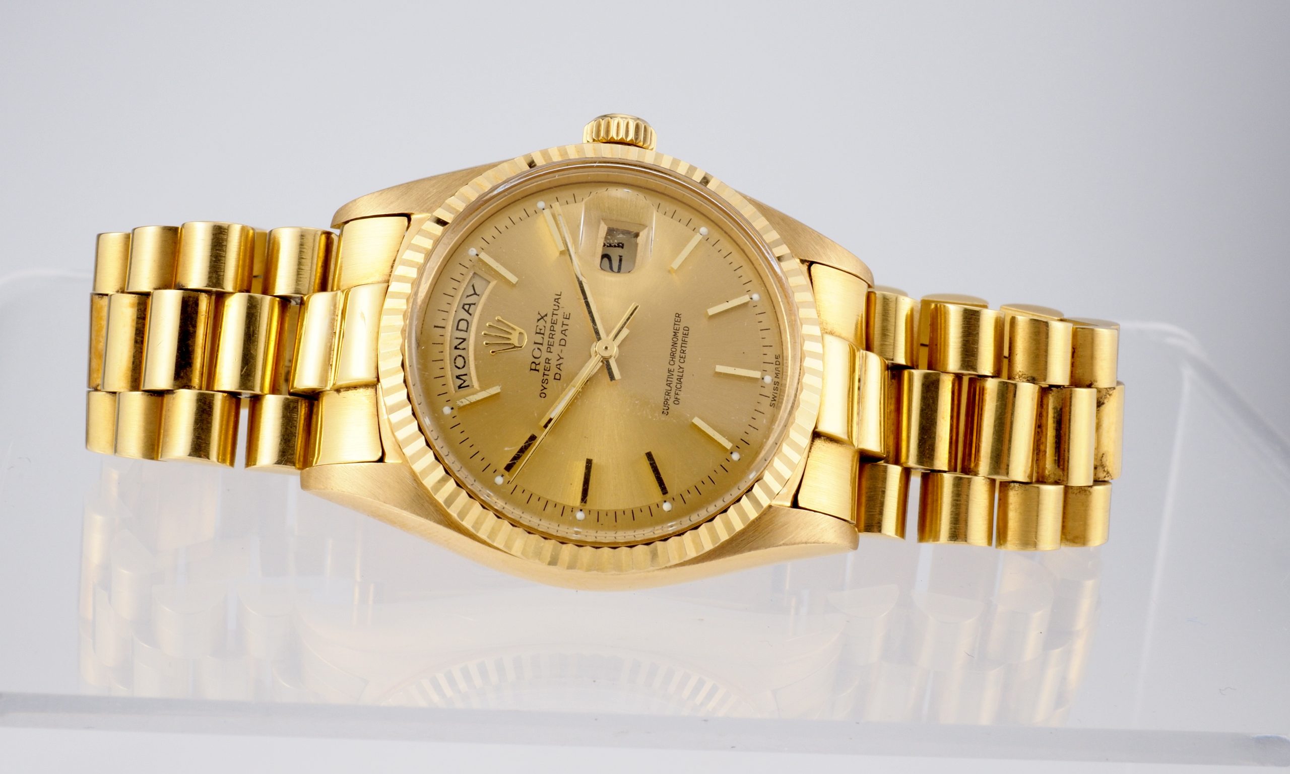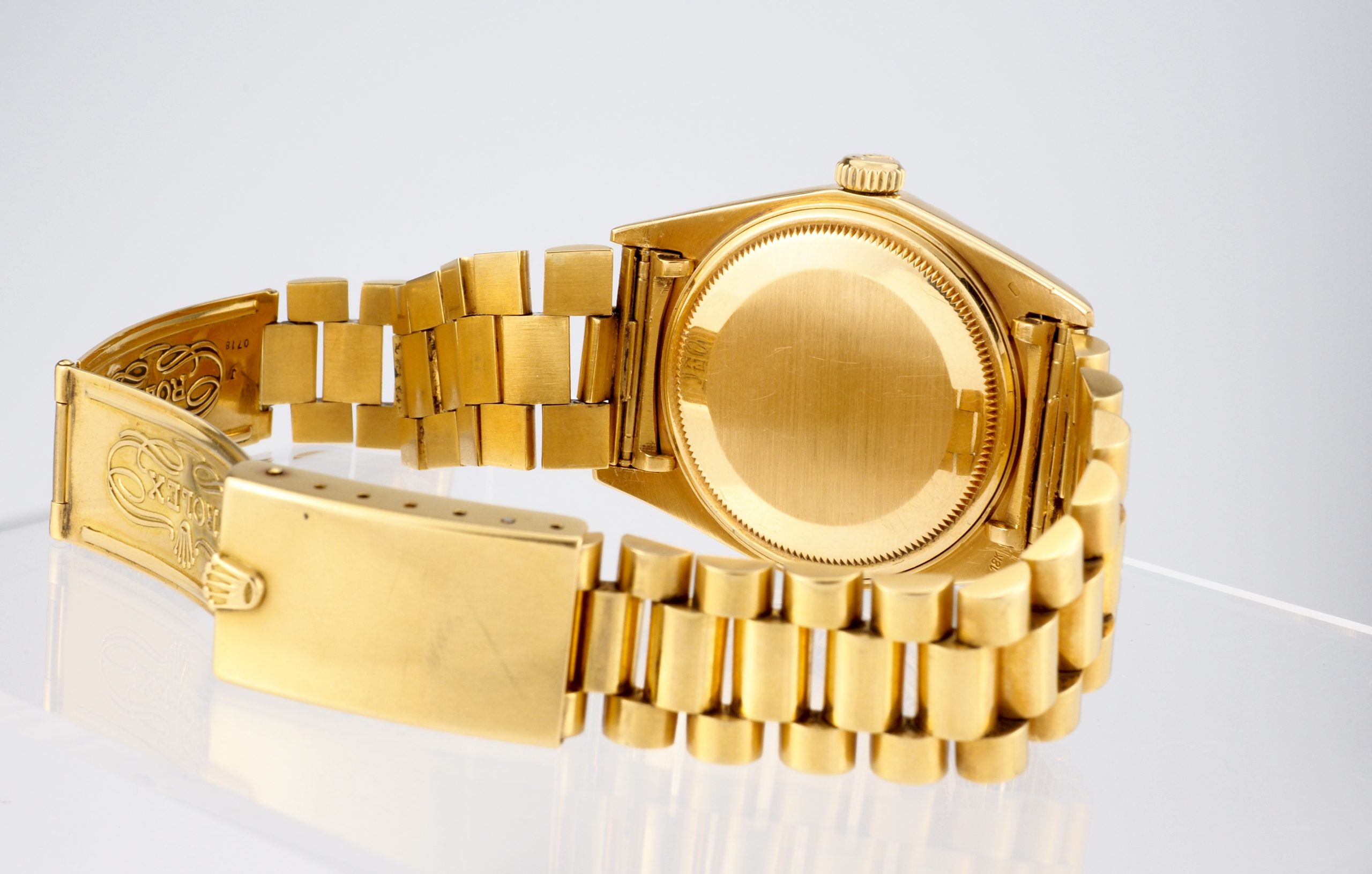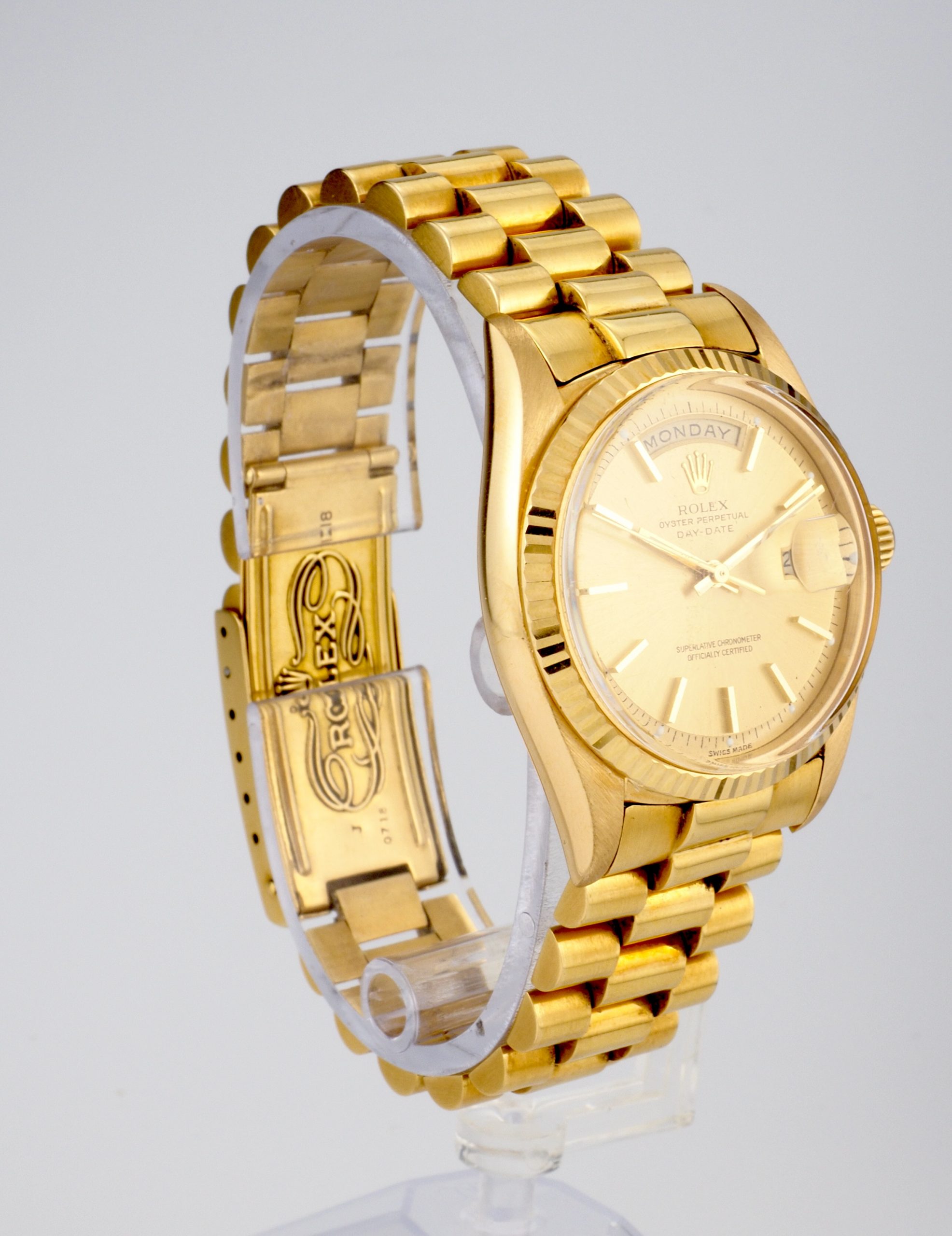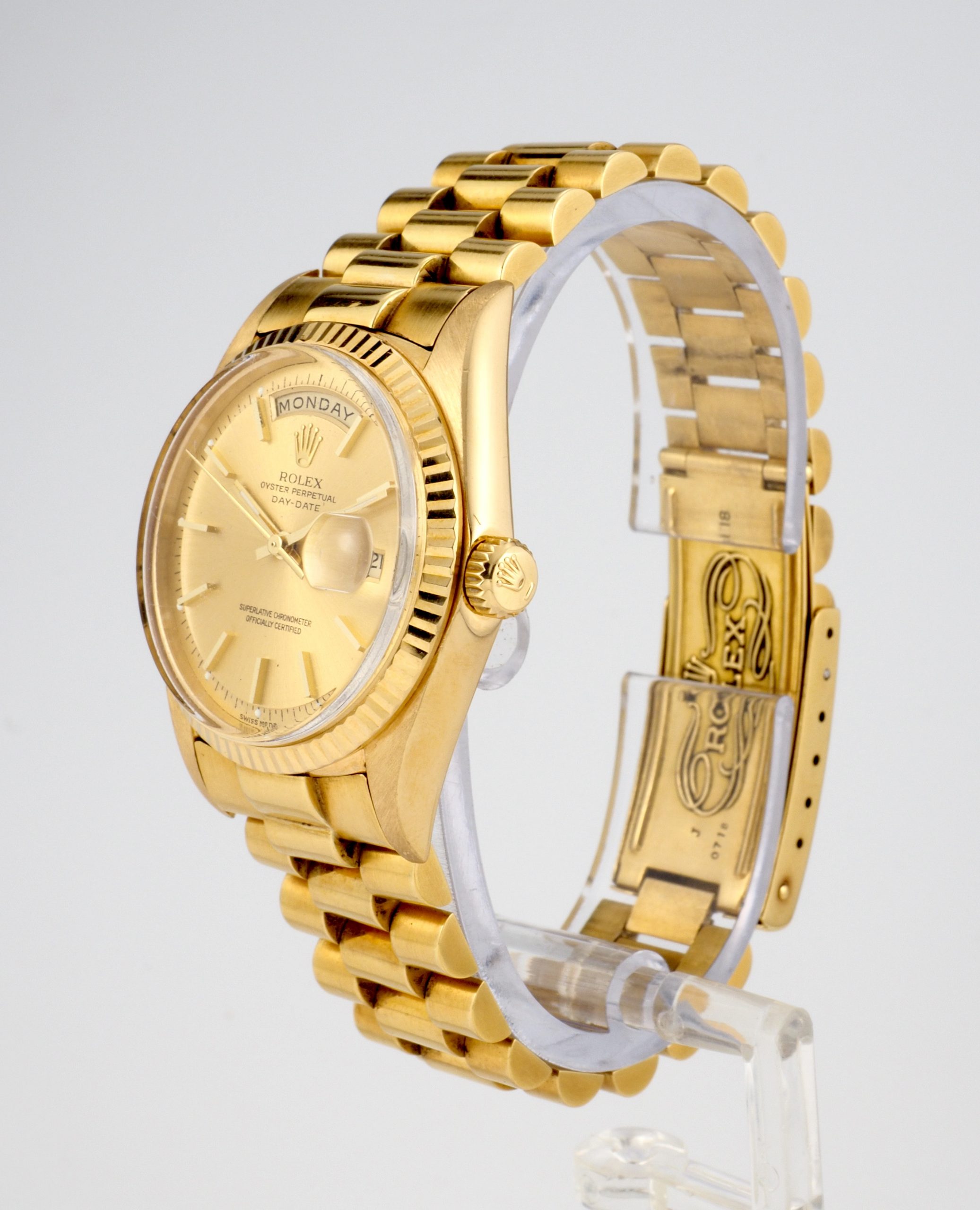 A truly exceptional complete set, this Rolex Day-Date Ref. 1803 in yellow gold is an outstanding offering for the discerning collector. Elevating its appeal even further, the watch is fitted not with a standard Jubilee bracelet, but with the highly collectible Big Logo Jubilee, a particularly desirable variation admired by enthusiasts.