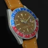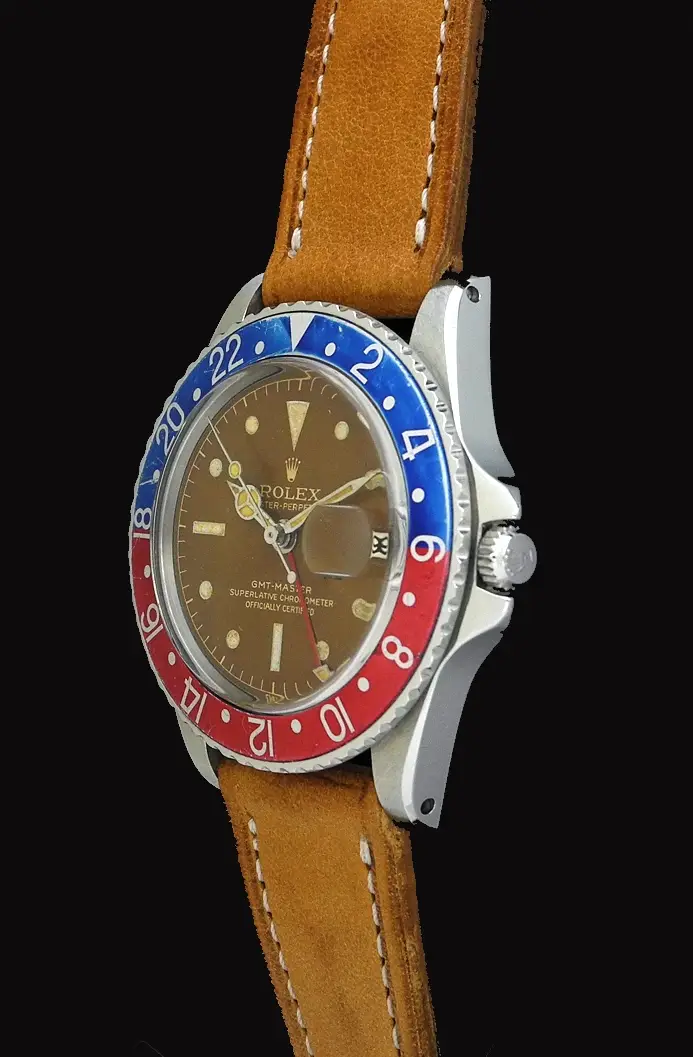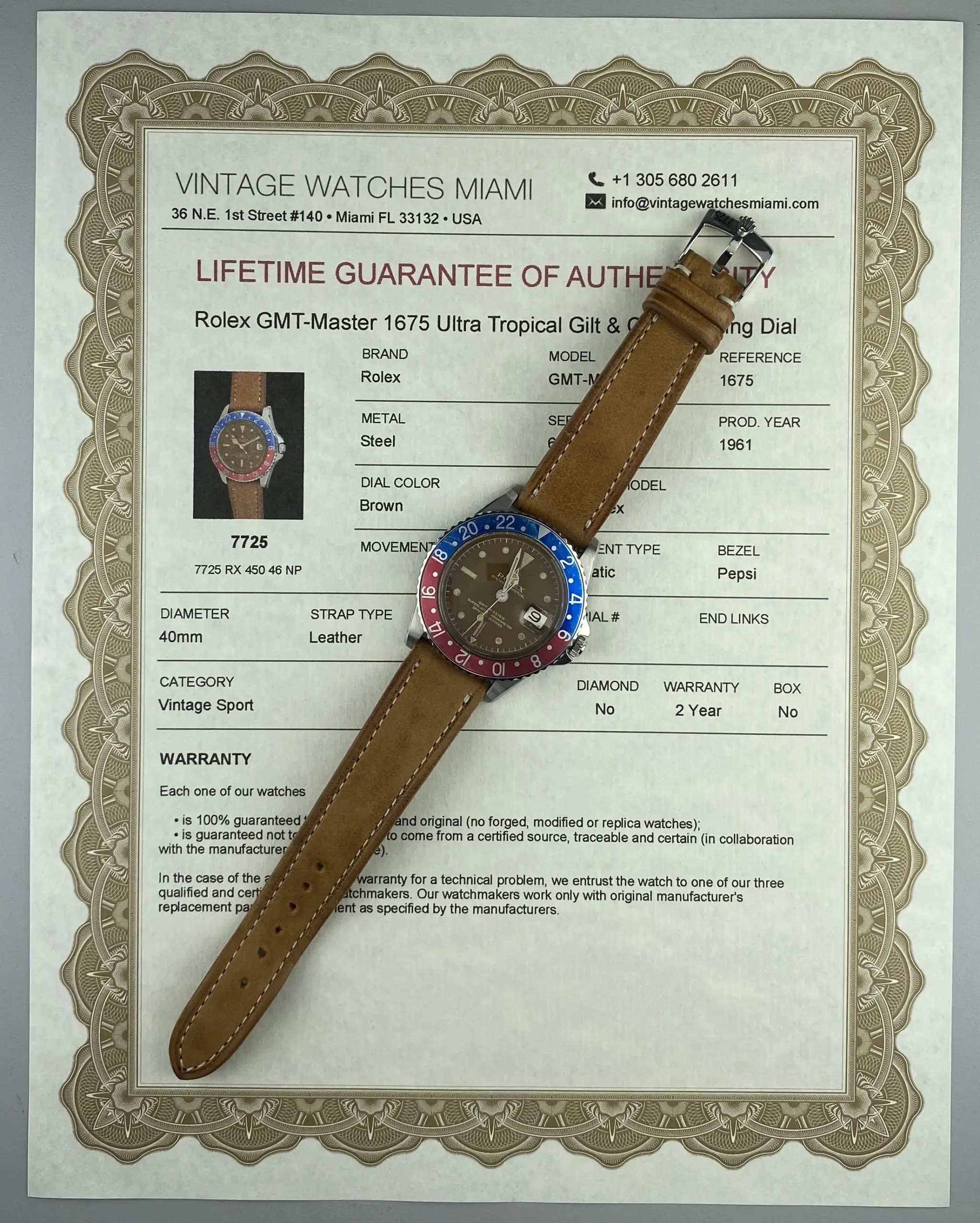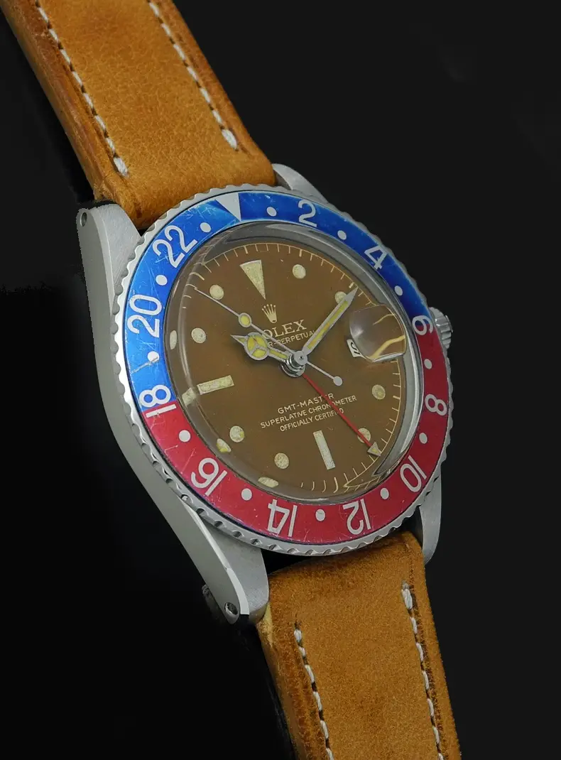 We have some very interesting GMT’s but this one is by far our most unique and special example. What we have here is an ultra brown – chapter ring – exclamation mark – cornino crown guard Rolex GMT-Master 1675 from 1961. Words cannot describe accurately what this watch looks like in person and on the wrist. Our passion and love for early 1675’s is reassured with this watch.