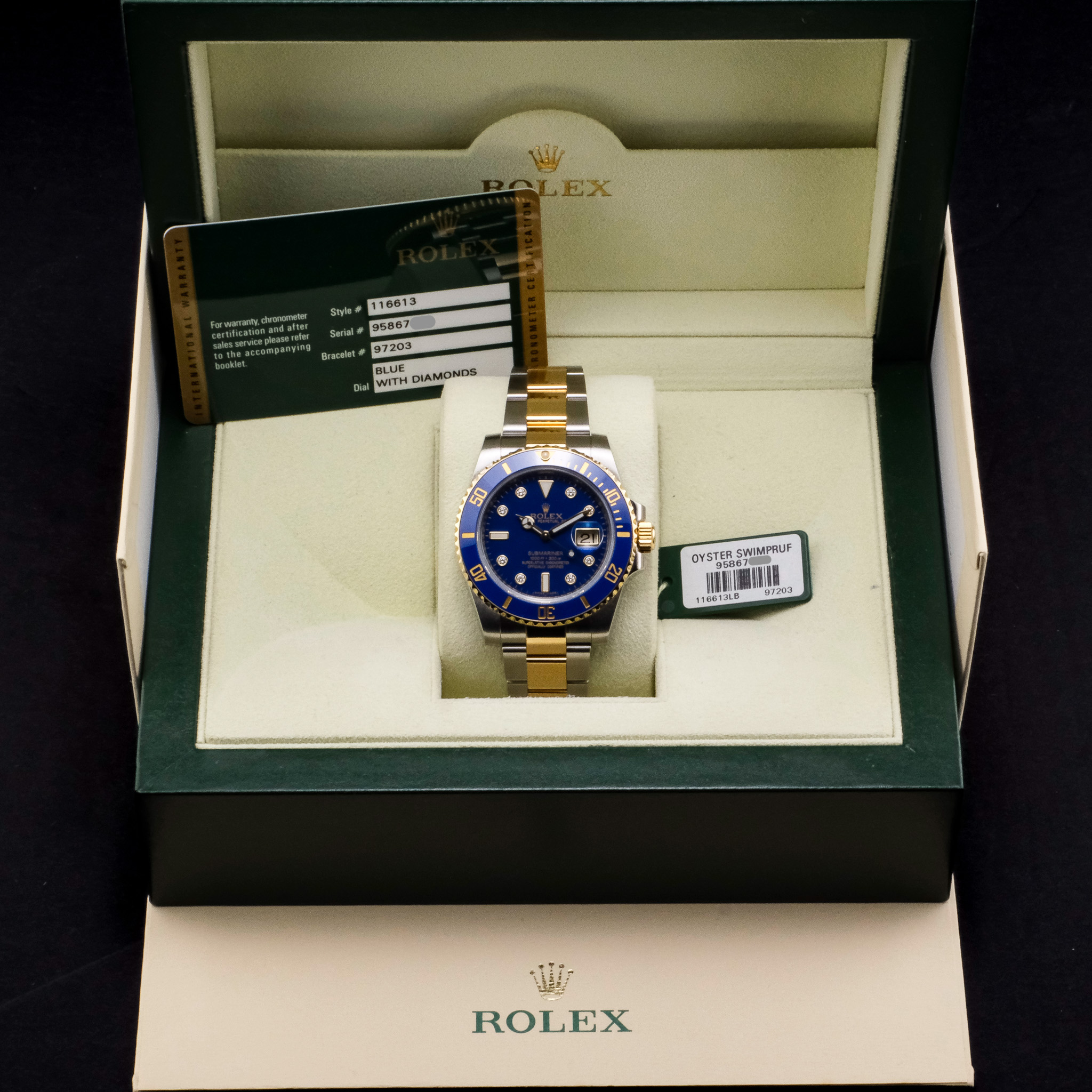 Beautiful and sporty Rolex Submariner ref. 116613LB with factory set diamond dial. The ever-green appealing combination of the two-tone case and blue dial is additionally embellished by the factory set diamond indexes. Sold in 2014, preserved in like-new conditions it comes original with box and papers as well as our 2 year warranty and lifetime certificate of authenticity.